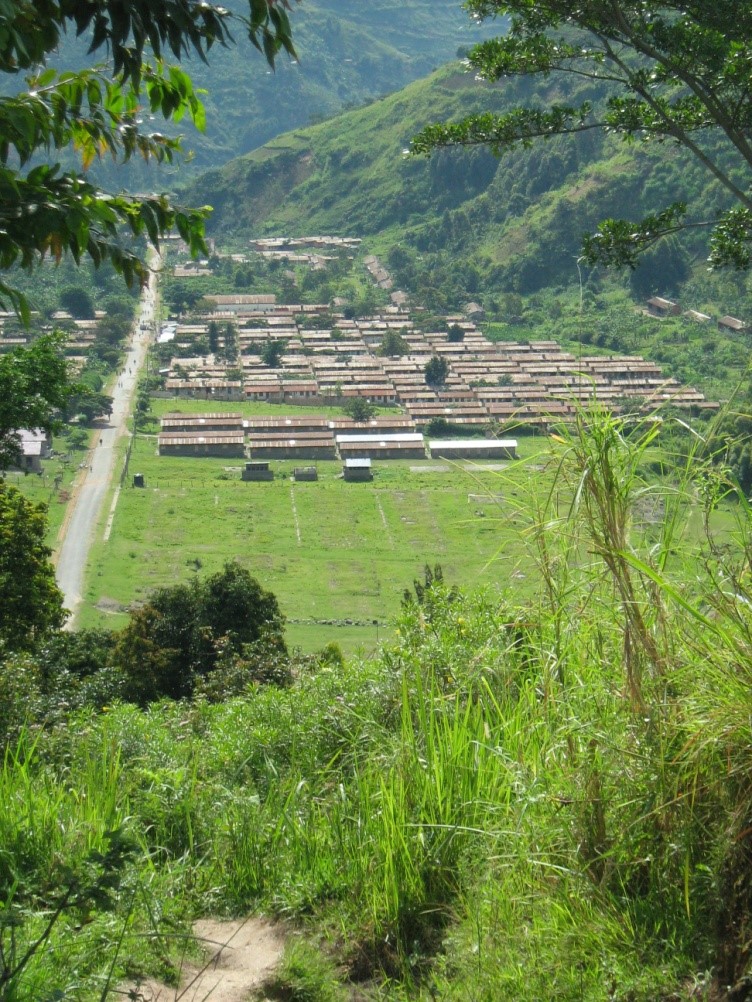 (Fig i – showing the tarmac road from Trekkers base camp [out of picture] and the track up the hill). The houses were originally the workers’ accommodation at the Kilembe mining camp.